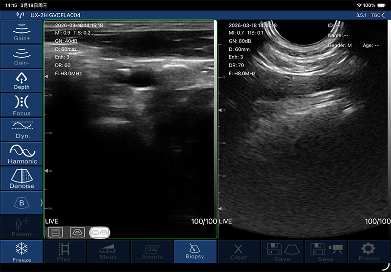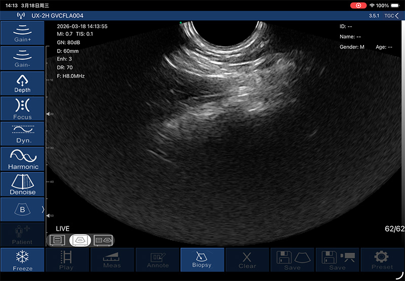• 探头频率:6.5MHz/8MHz,线阵腔内二种模式,长按开关键切换