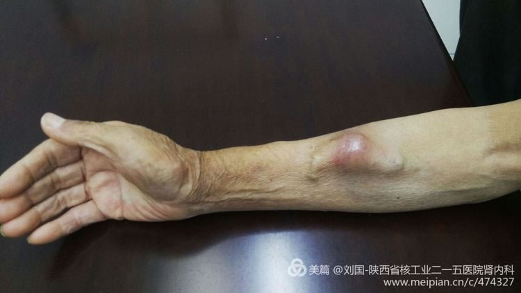 The patient’s elbow brachial artery was punctured to cause his local swelling by mistake during hematodialysis when he was in hospital in the first time, which caused. There was a crevasse confirmed by the ultrasound on his brachtial artery, and it was healed after a part of his brachial artery was compressed.